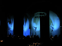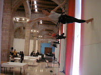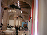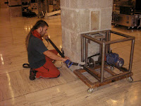 La sala buida abans de començar el muntatge, en Juli amb un dels motors que fa moure les cordes d’on pengen les ballarines, assajos mentres els cambrers paraven les taules i en Rober a la taula de llums.