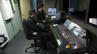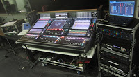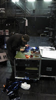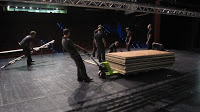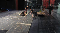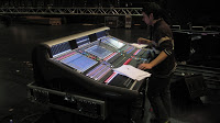 I unes poques fotos: viatge amb l’AVE amb en Marc, en Joan i en Carles, muntant el terra que portem, els dos controls de so (monitors i FOH, amb dues Digico SD7), el control de llums (amb dues Grand MA), el teatre, en Marc com si fos una estrella del Festival de Otoño, en Pau tallant filtres.