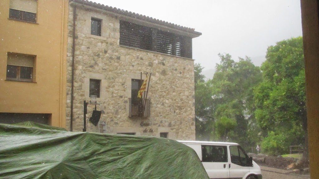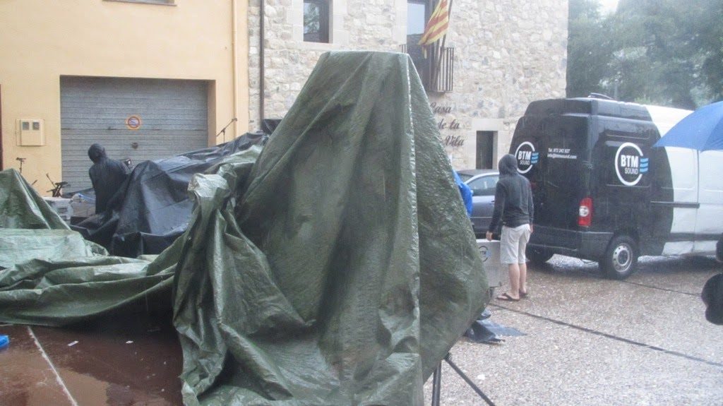 Smoumolnö començava a provar la bateria, va començar a ploure, a pedregar, a ventar… Els plàstics que tapaven els equips de so i llums i la carpa del control s’havien d’aguantar amb les mans perquè no sortissin volant.