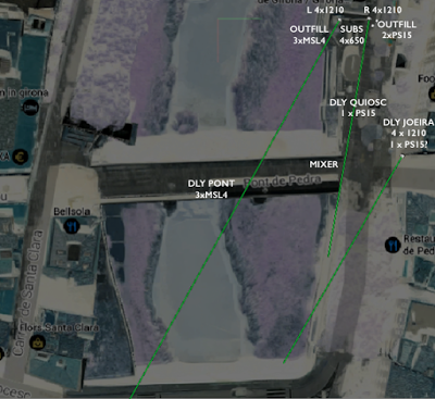 Alguns detalls del disseny. Plànol de situació dels diferents subsistemes. Els feixos en verd corresponen als sistemes Nexo. Els sistemes Meyer es va calcular amb el Mapp.