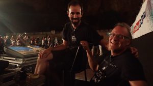 Si ho arribo a saber abans la nit abans del primer bolo vaig a dormir una mica més aviat a les festes del poble, a Bescanó… Al despertar-me cap al migdia tenia un whatsapp demanant si podia anar a Sant Feliu… Però no va ser gaire dur, en Carles ja havia fet, durant el matí, el muntatge dels sidefills i la microfonia.  A mi em quedava fer l’assistència al tècnic.