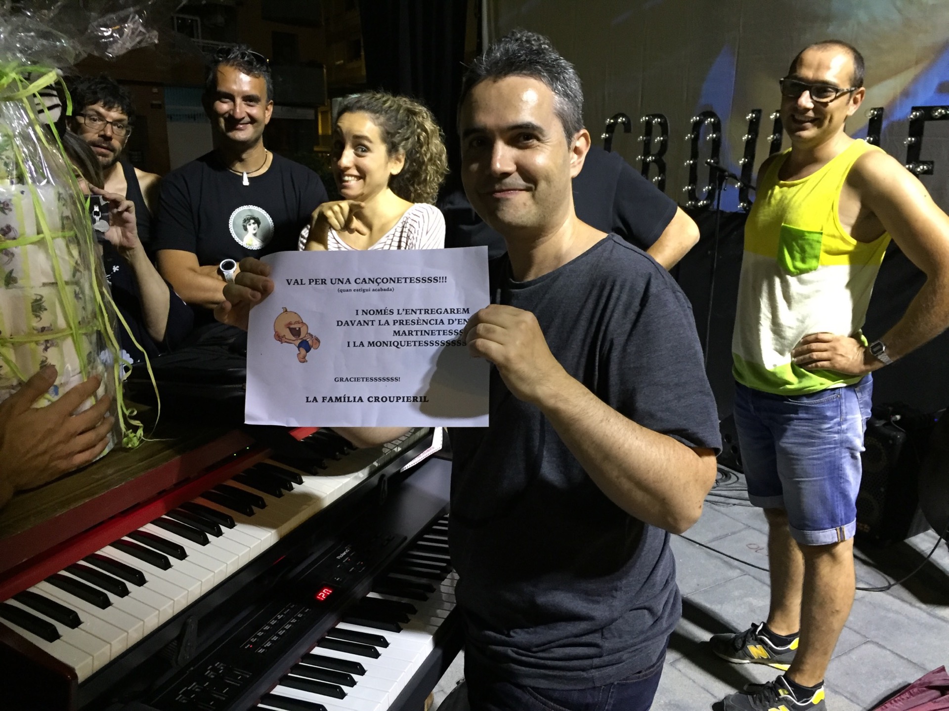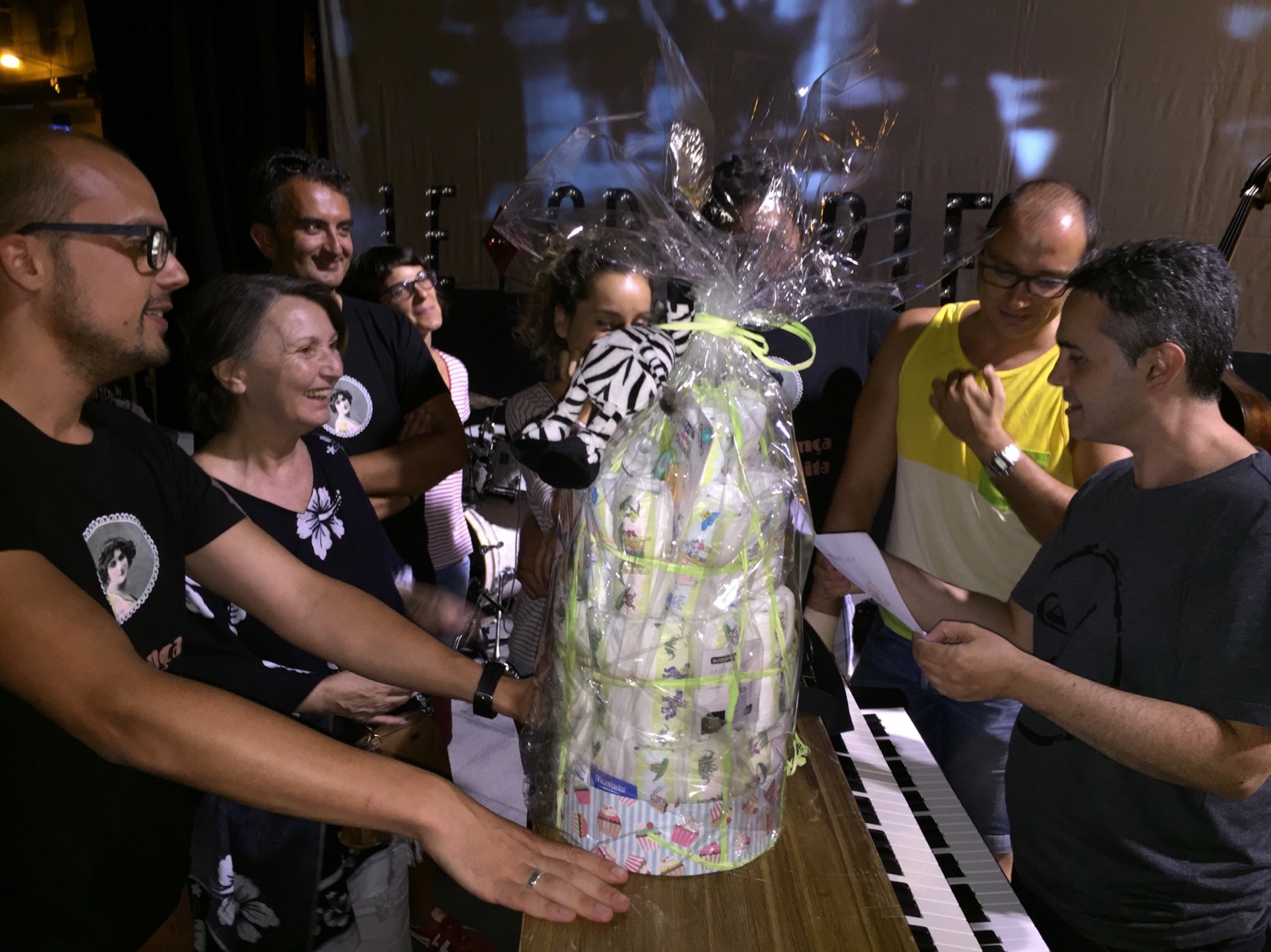 Després de les proves de so vam fer entrega d’aquest fantàstic pastís de bolquers a l’Antonietesssss, que va ser pare amb la Mònica fa algunes setmanes. Enhorabona!