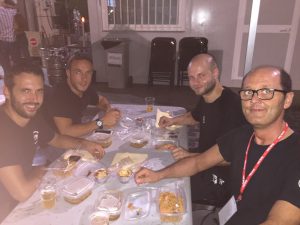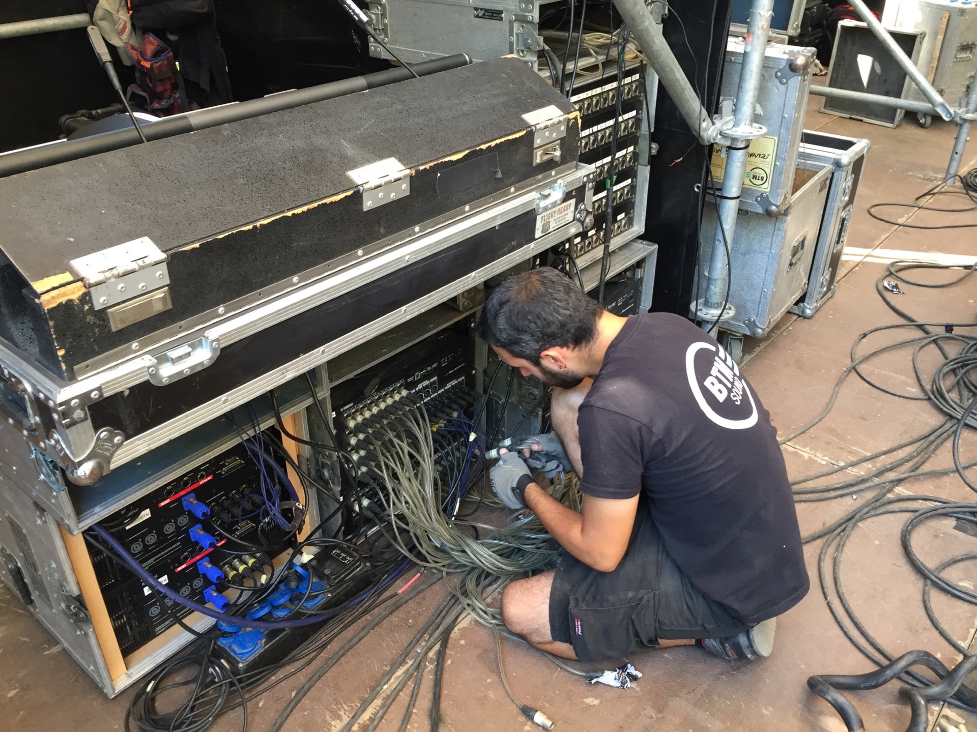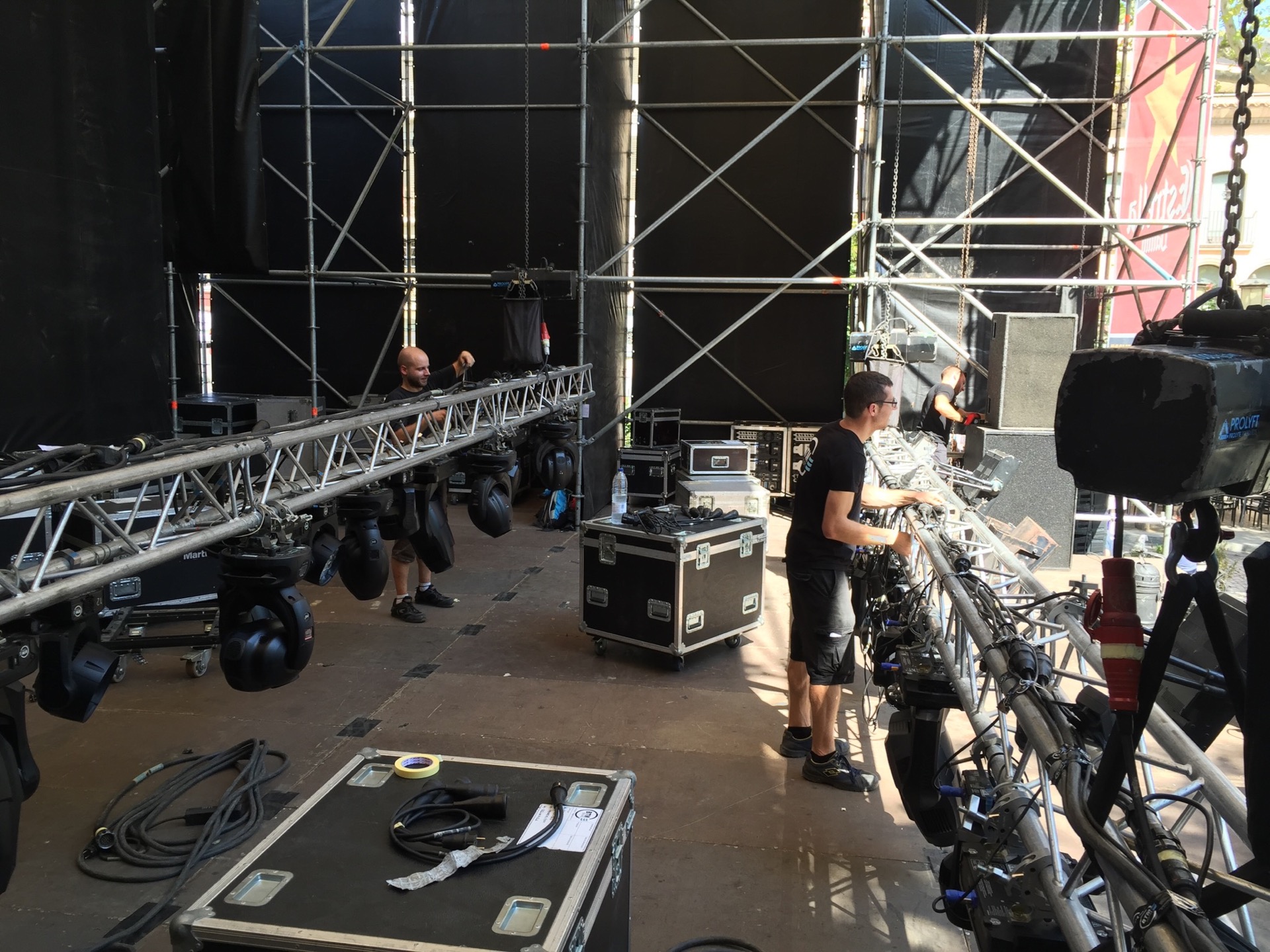 Una de les bones i que valoro molt és anar-hi amb el personal que hi hem anat. Treballar amb en Dani Rigall i l’Albert Mosoll (il·luminació), en Dani Ventura (monitors) i en Sergi Rossell (microfonista) no té preu, perquè saps que no has de patir per massa res. Ah sí, potser has de patir per no morir de riure i de bon humor! Quin plaer treballar així! Ep, i també ens ha acompanyat el dia de muntatge, a l’espectacle dels 15 anys (un bon pollastre!) i durant el desmuntatge la darrera incorporació a BTM, l’Àlex Martínez, que de mica en mica va agafant experiència. Sap escoltar i sap preguntar quan fa falta. Ah, i també encaixar alguna “colleja carinyosa” quan és necessari! Aprendre és equivocar-se i corregir els errors.