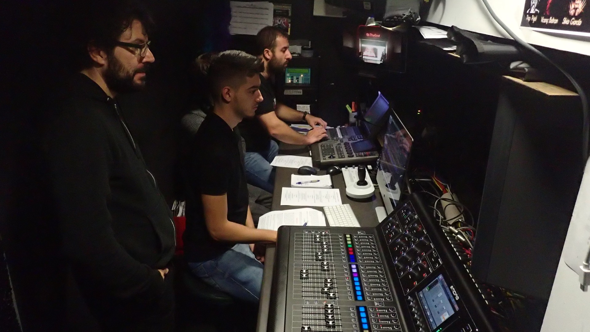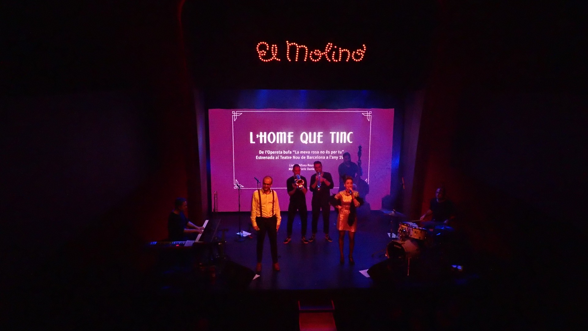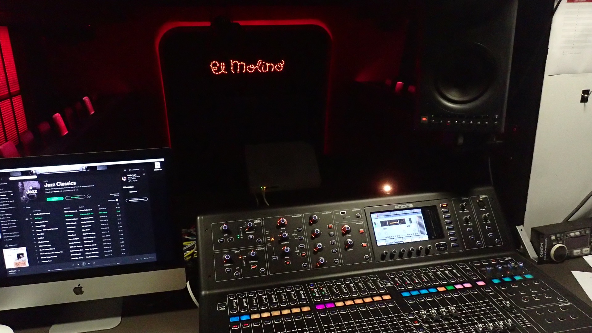El Molino té una bona acústica i un equipament molt digne per un sala. Disposa d’un sistema d’altaveus convencionals distribuïts pel local amb dos subgreus en configuració LR i uns quants monitors. Suficient per fer una mescla semiacústica, integrant el so de la bateria i els vents -quasi a pèl- amb els instruments per línia i les veus. En espais com aquest si mimes el so augmenta encara més el glamour. I acostumat a no fer aquest tipus de mescla per no fer aquest tipus de bolos m’ho vaig passar pipa. Això sí, és imprescindible l’aplicació per a tablet de la Midas M32 per fer les proves des de baix a platea i el bolo des del primer pis, que no estava obert al públic. La cabina del Molino seria segurament l’única cosa que podria dir que no em va acabar de fer el pes… no es pot tenir tot!!! En Néstor em va donar un cop de mà amb les seves indicacions sobre la sonorització. No hi ha com fer cas als de la casa!