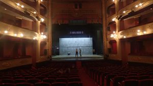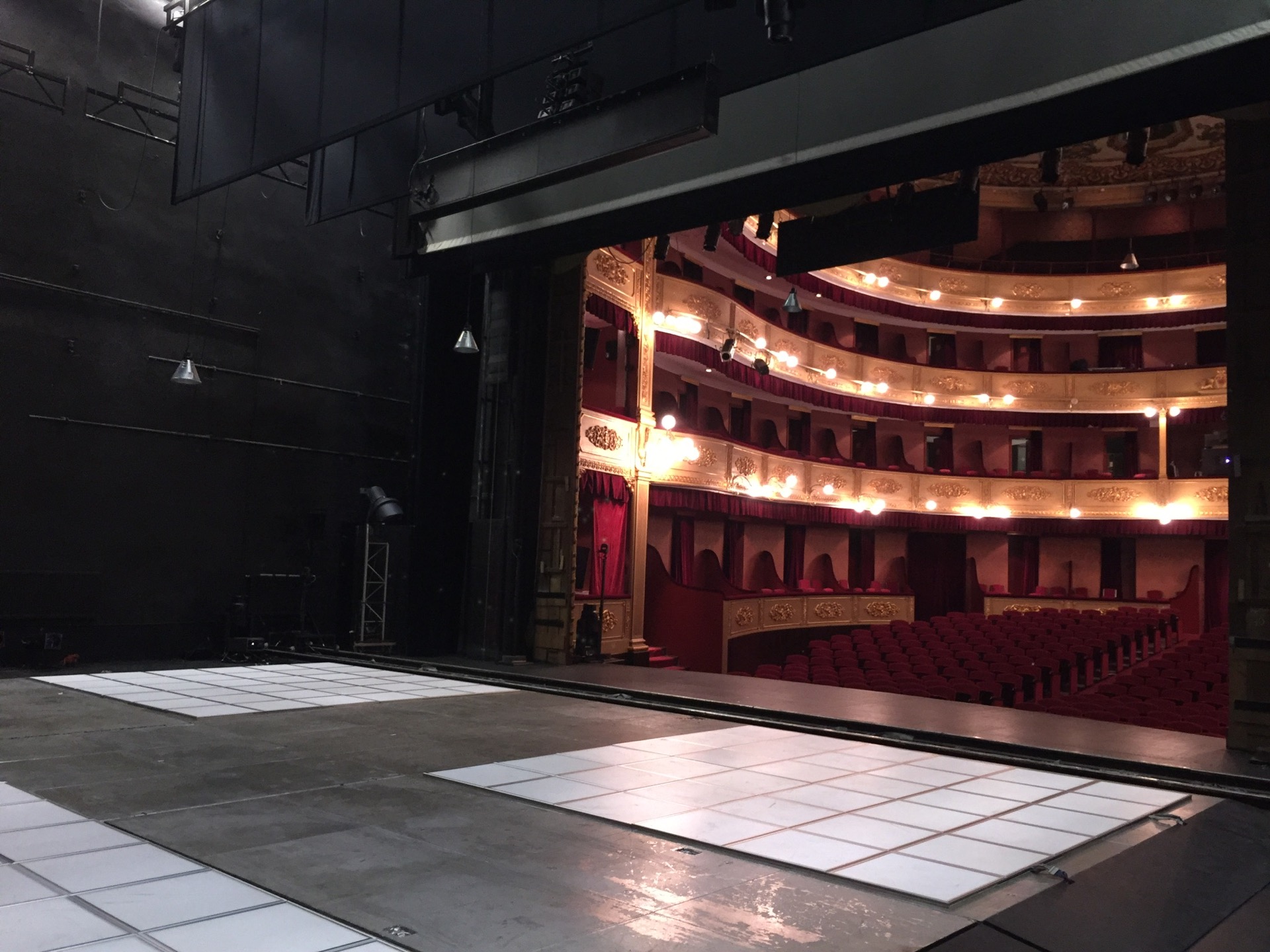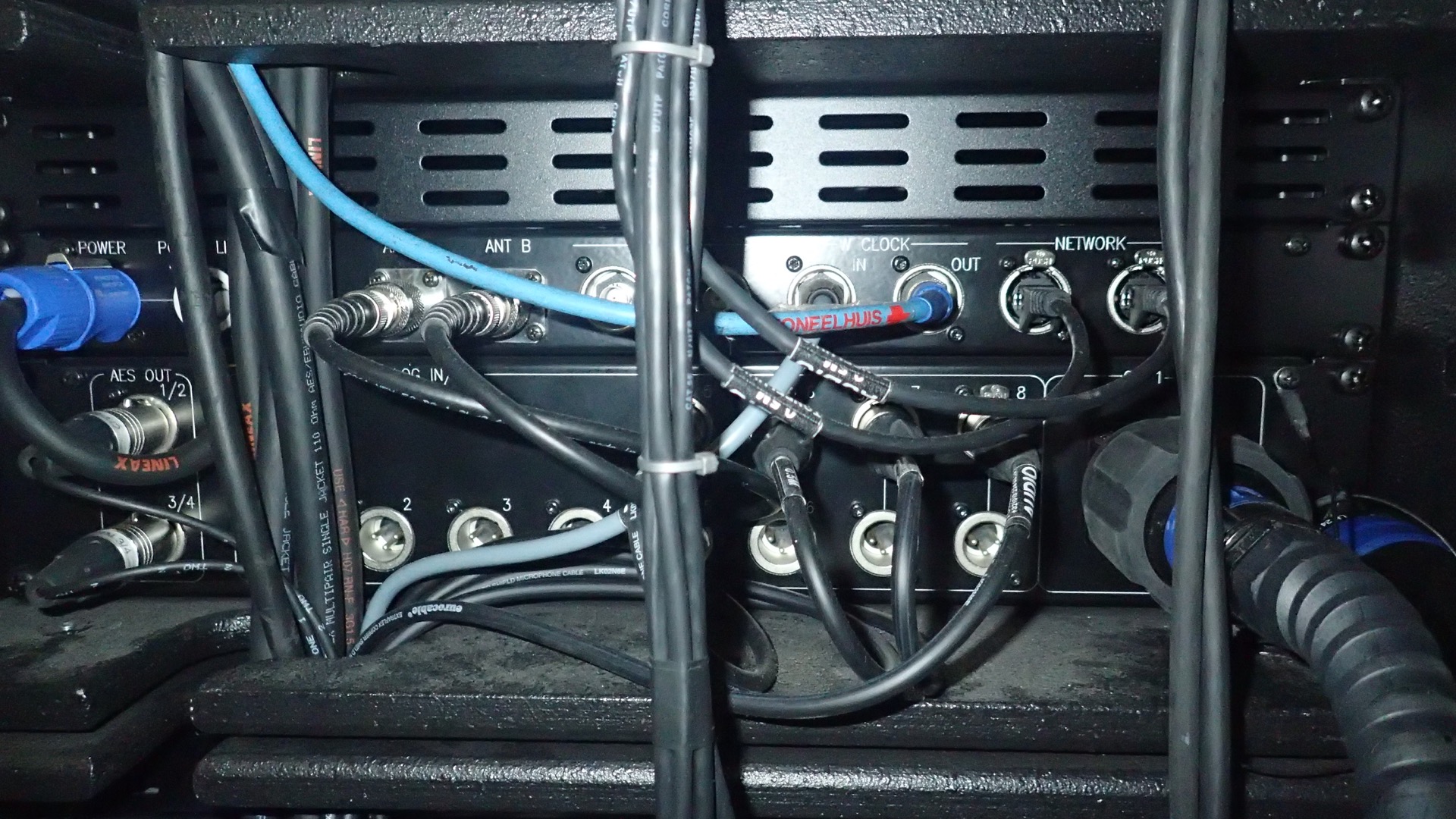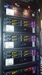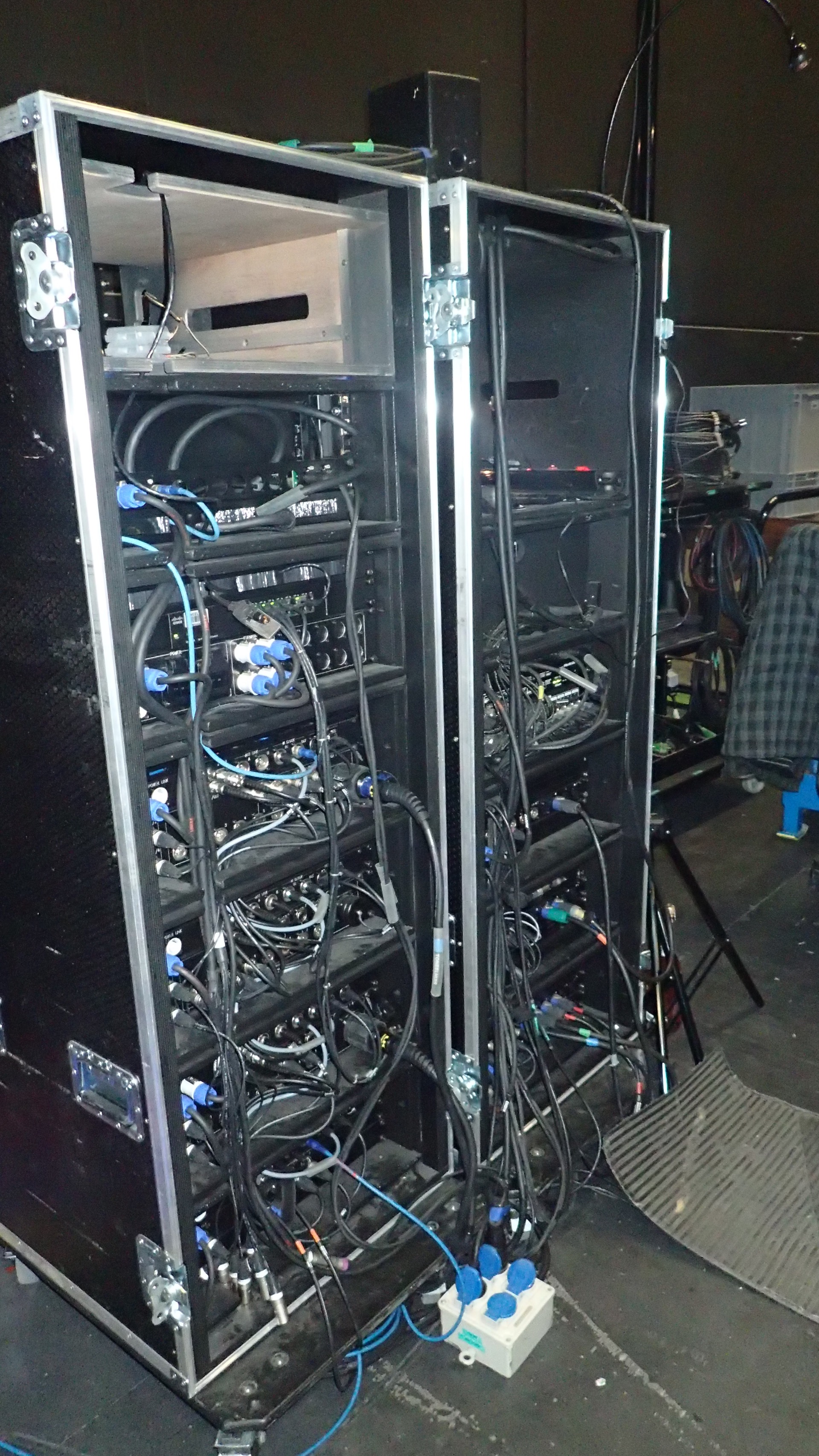 La companyia portava pràcticament tot el so, llevat del sistema de so del teatre (6 Nexo PS15, 4 PS8), que es va ampliar amb un cluster central i retards en alguns pisos de les llotges. Racks configurats a mida, taula de so, taula de llums, vídeo, algunes etapes de potència, microfonia, escenografia, etc… Tot propi. I tot perfectament marcat, identificat, ben cuidat, ordenat… Oh com em posa això!