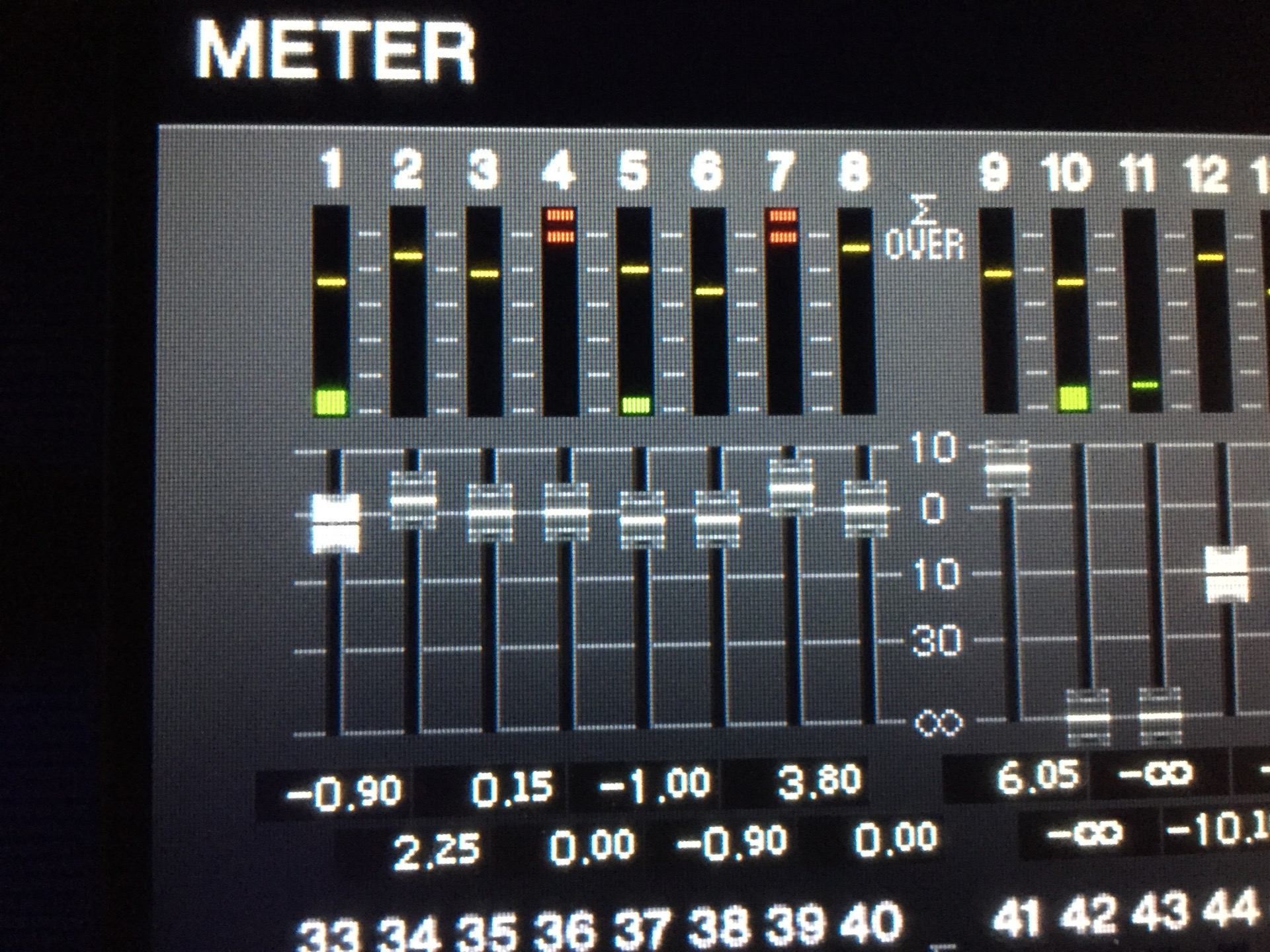 Al final poso una foto dels input meters en peak hold on es veuen els clips de dos canals de veu. Aquests flamencos són tremendos! Tot i atenuar les petaques a -42dB (no entro a valorar com pot pujar el soroll de fons segons el material que tinguis), deixar un marge considerable de guany a les proves i comprovar a l’assaig que encara hi havia marge, arriba la funció, canten el primer Martinete i a vegades NO s’acaben el marge. Tampoc ajuda gaire, que malgrat els hi posem les diademes a lloc, s’acabin movent. Les hauríem de fixar amb loctite… Tanmateix van ser clips puntuals, res greu. Però és espectacular el marge dinàmic que tenen aquests cantores! Un dia hauria de mesurar quants dB hi ha a un pam de la boca. Faré la mesura amb taps…