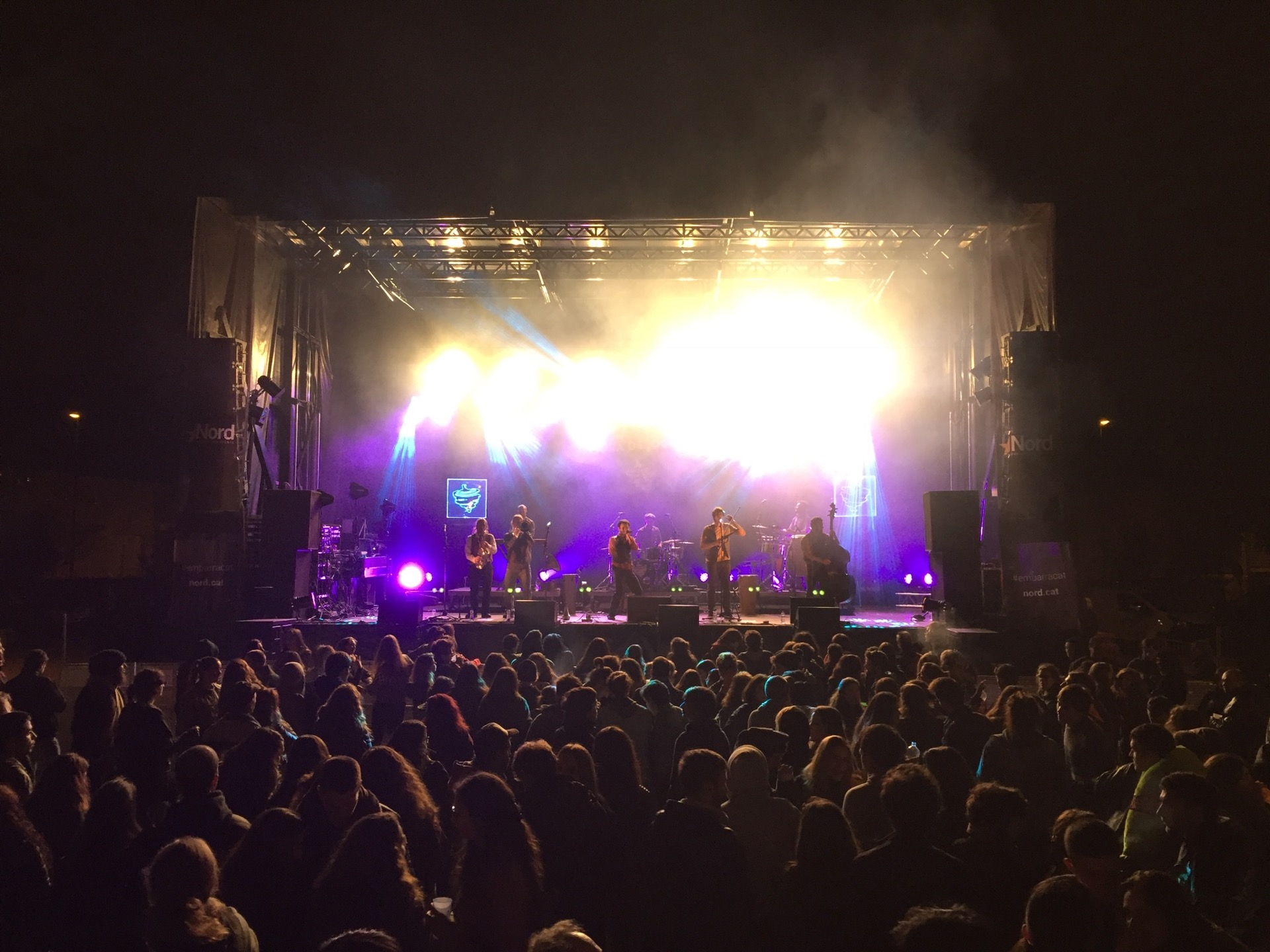 Fred, molta fred! Mesclar a l’exterior en condicions de fred no mola gens. I això que era a finals d’abril. Però vam enganxar una bona baixada de les temperatures. I amb vent. Era a l’Embarraca’t, hi havia Nord Produccions, amb Nexo GEOS12, 7 caixes per costat, CL5 a FOH i PM5 a monitors. Camió escenari d’aquests amb dos braços hidràulics que fan que la PA quedi a una alçada determinada pel braç en comptes de per un criteri de disseny de sistemes. El control de FOH diria que estava a 1.50m d’alçada. No és cap drama, només faltaria, però els tècnics hauríem de mesclar a l’alçada a la que està la gent per sentir el que arriba a la gent. Res, un detallet. Prou feines tenia a moure els dits amb la fred, he he!! Bon ambient i atenció del personal de Nord. Gràcies nois!